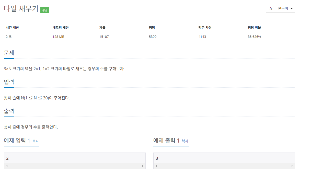 2xn타일링 문제랑 비슷한 문제이다. 그래서 비슷하게 접근했다가 바로 틀려버렸다.