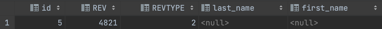 envers로 만들어진 이력 관리 테이블에서 삭제 이력 같은 경우엔 아래와 같이 REVTYPE은 2로, ID와 REV를 제외한 나머지 값은 null로 저장된다.