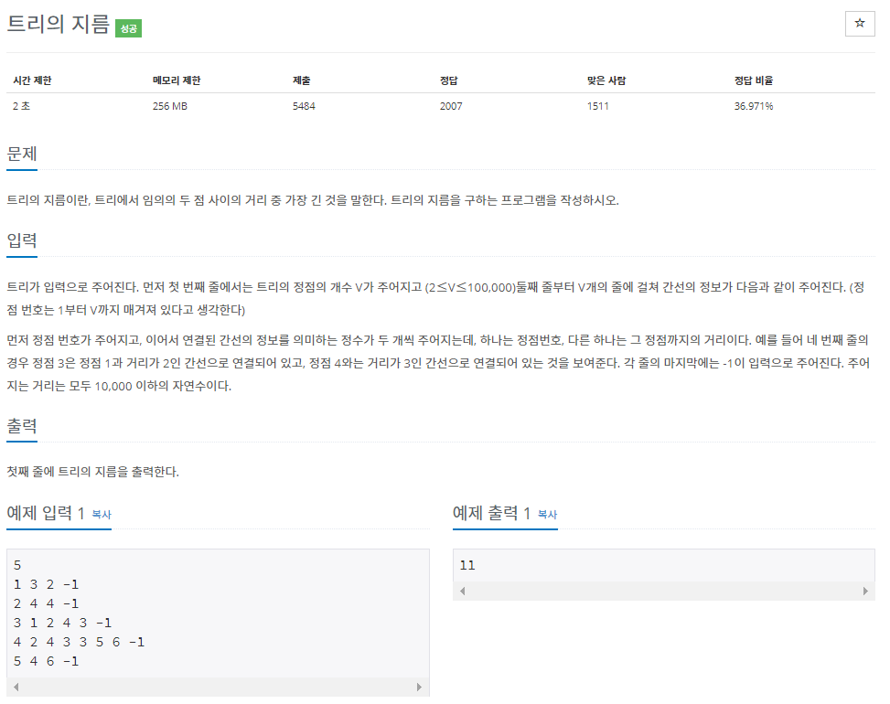 트리에 존재하는 모든 경로 중 가장 긴 것의 길이를 트리의 지름이라고 한다.