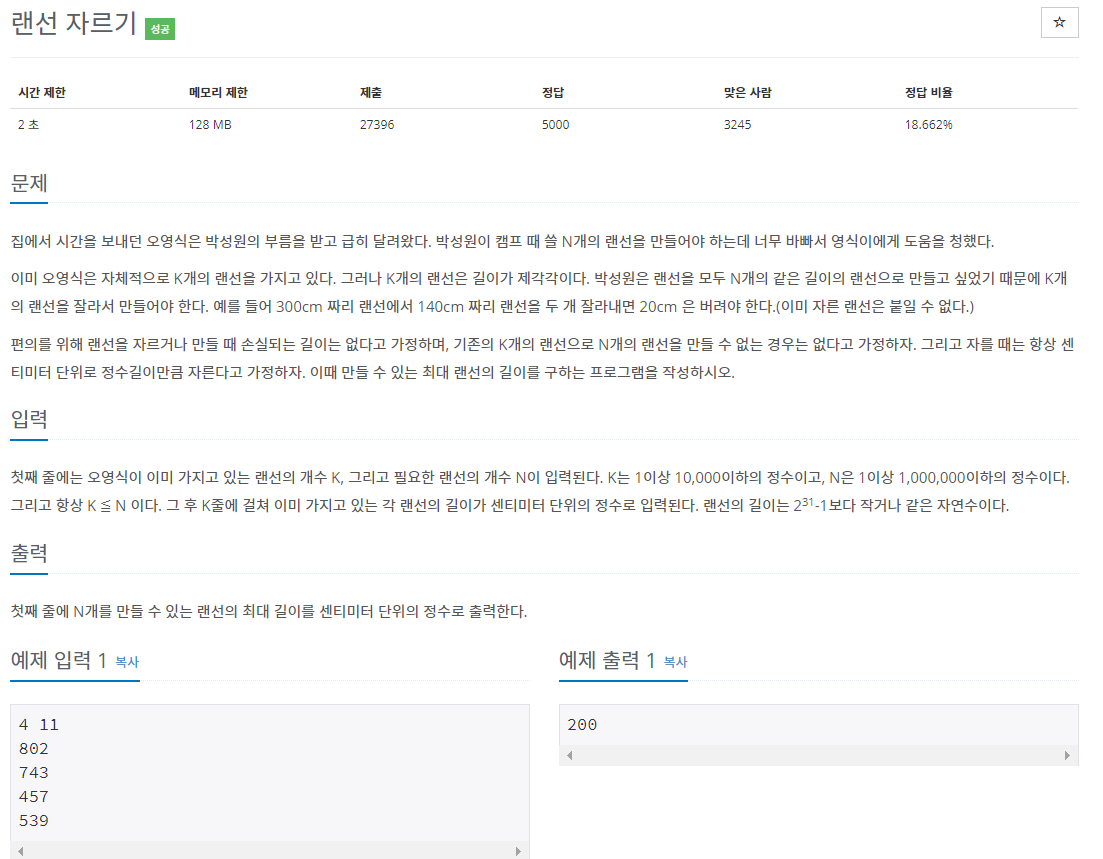 이분 탐색 문제인 랜선 자르기 문제이다.