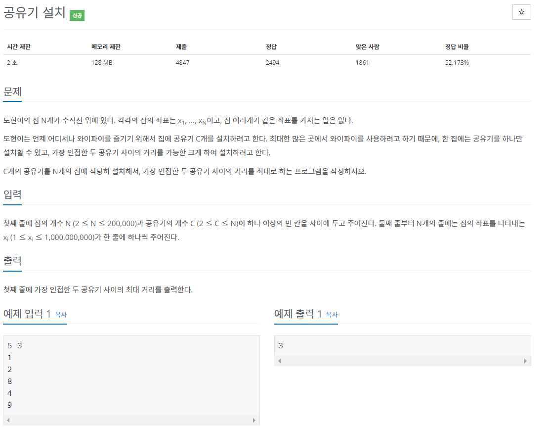 문제의 요점은 가장 인접한 두 공유기 사이의 거리를 최대로 하는 프로그램을 작성하는 것인데