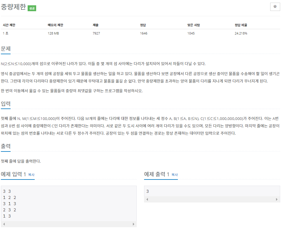 이분탐색 문제인 중량제한이다.