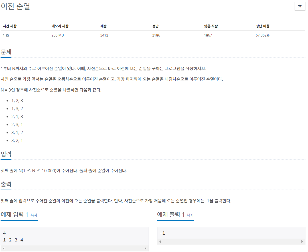 위 내용을 통해 백준 10972 다음 순열 문제와 10973 이전 순열 문제를 풀어보자.