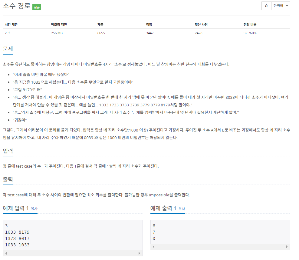 그 수가 소수이면 큐에 넣어서 BFS탐색을 하면 됐었다.