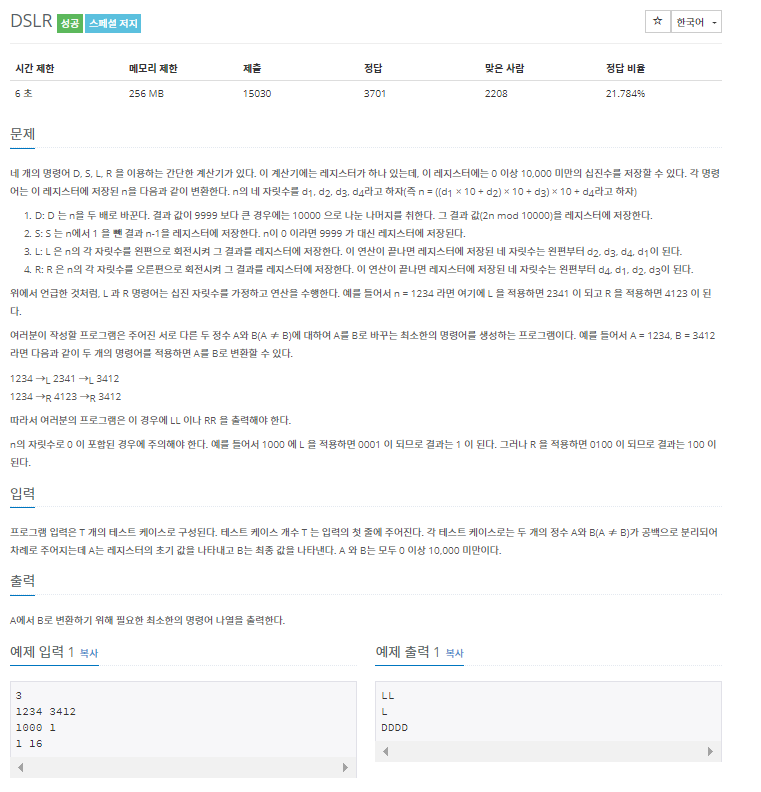 완전 탐색으로 가능한 문제인 DSLR 문제이다. 정답률은 난이도에 비해 많이 낮은 것 같은 21%이다.